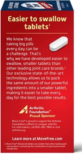 Centrum Move Free Advanced Joint Support Tablets provide 1500mg of Glucosamine and Chondroitin per serving to support joint health, flexibility, and comfort. This advanced formula is designed to help maintain mobility and overall joint function.